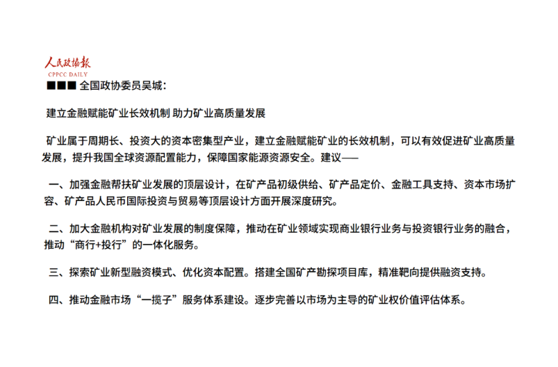 全國政協委員吳城:建立金融賦能礦業長效機制 助力礦業高質量發(fā)展