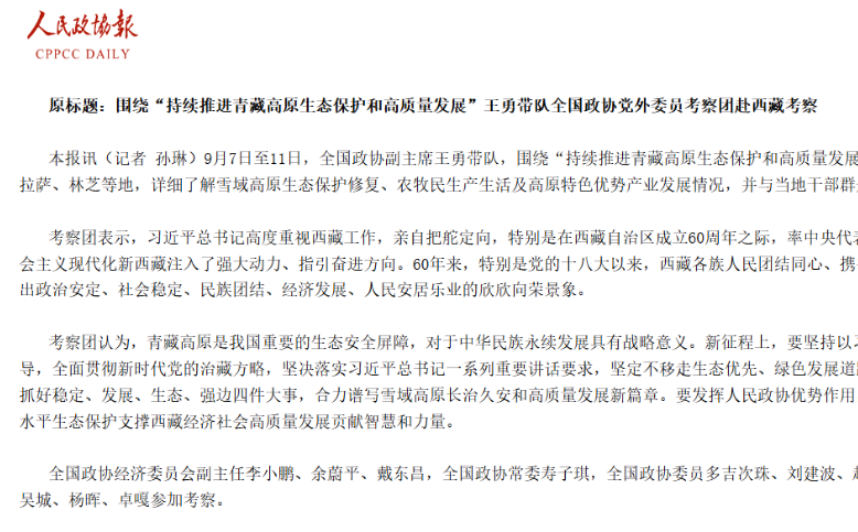 9月7日至11日,全國政協副主席王勇帶隊,圍繞“持續推進青藏高原生態(tài)保護和高質量發(fā)展”...